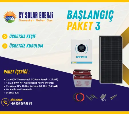 CY Solar Enerji’nin Başlangıç Paket 3 çözümü; 2 adet Tommatech 600W Monokristal Half-Cut TopCon panel, NP Hybrid 3.500W akıllı MPPT inverter ve 2 adet Apex 12V 100Ah karbon jel akü ile karavan, bağ evi, tiny house ve şebekeden bağımsız yaşam alanları için güçlü ve stabil off-grid enerji sağlar.