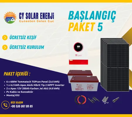 CY Solar Enerji’nin Başlangıç Paket 5 çözümü; 6 adet Tommatech 600W Monokristal Half-Cut TopCon panel, Apex Hybrid 4.200W akıllı MPPT inverter ve 2 adet Apex 12V 200Ah karbon jel akü ile bağ evi, tiny house, karavan ve şebekeden bağımsız alanlarda yüksek enerji ihtiyacı olan kullanıcılar için tasarlanmış güçlü ve uzun süreli off-grid enerji sistemi sunar.
